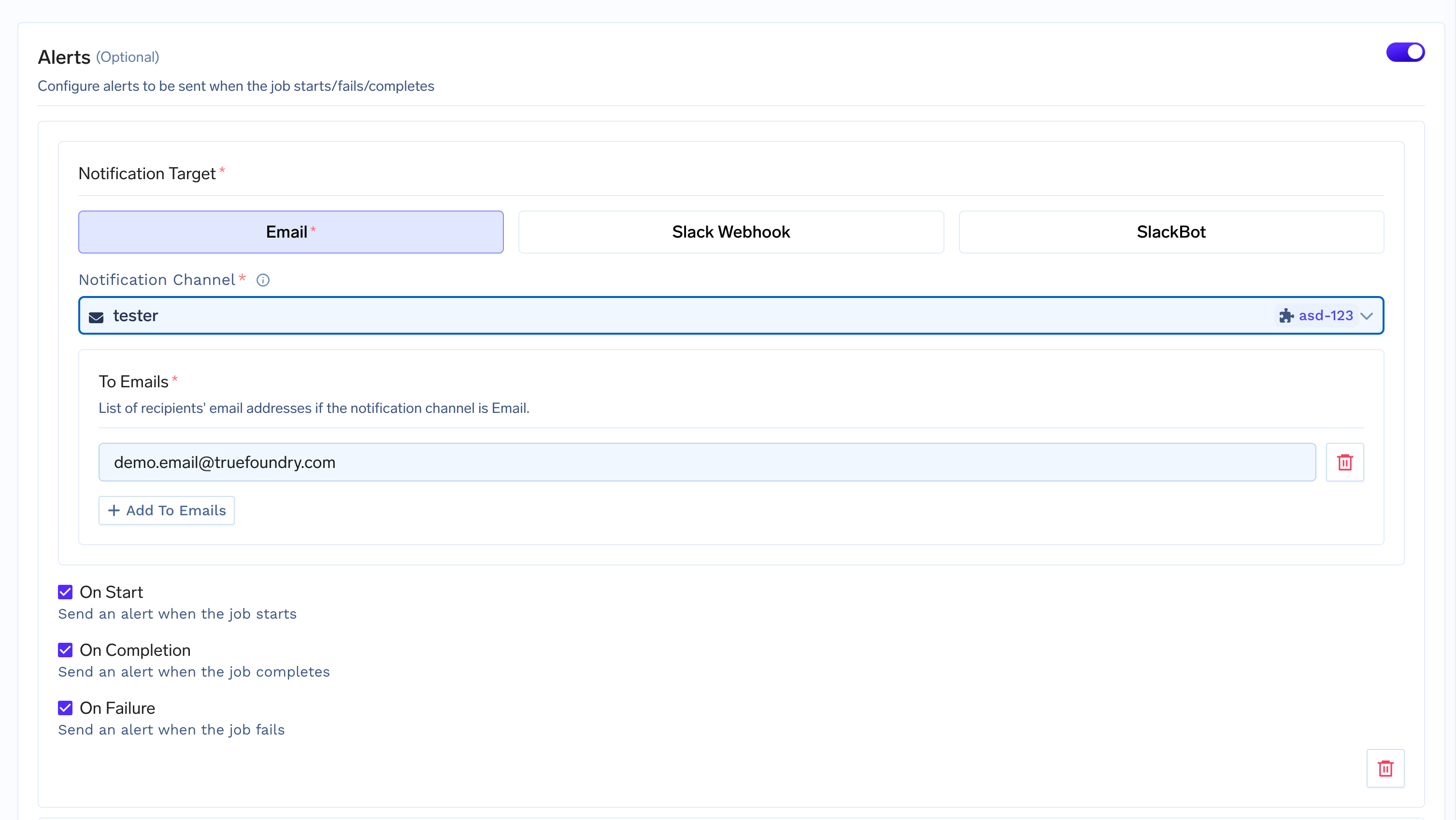 - There are three types of targets, one is email and the others are slack webhook and slack bot, you need to add an email/slack webhook/slack bot integration respectively and select it in notification channel field to use that integration for sending notifications.