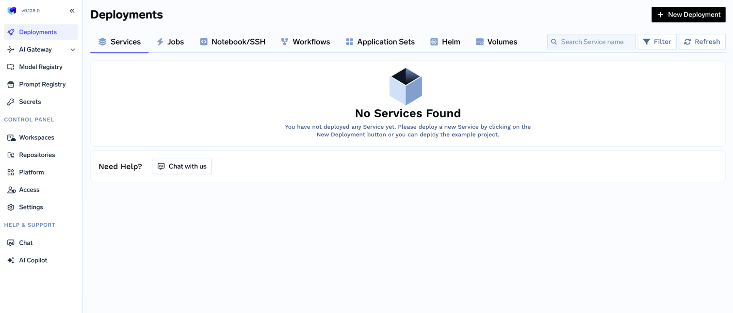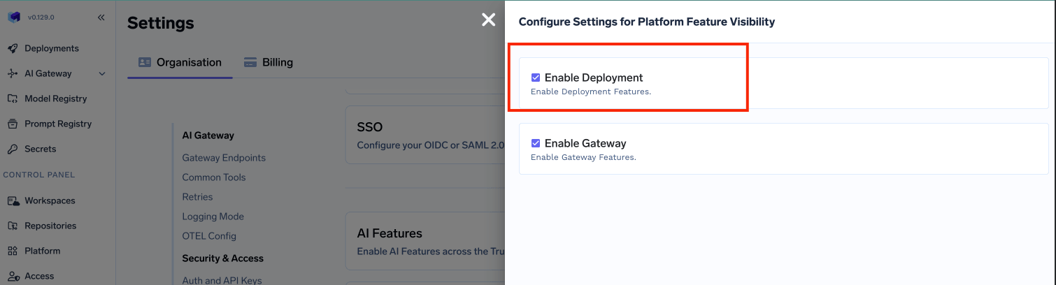 TrueFoundry control plane infrastructure is provisioned using OpenTofu/Terraform. You can download the OpenTofu/Terraform code for your exact account by filling up your account details and downloading a script that can be executed on your local machine. To perform the below steps, you need to register an account on TrueFoundry and login to the platform.Enable Deployment Feature in the Platform (Optional)