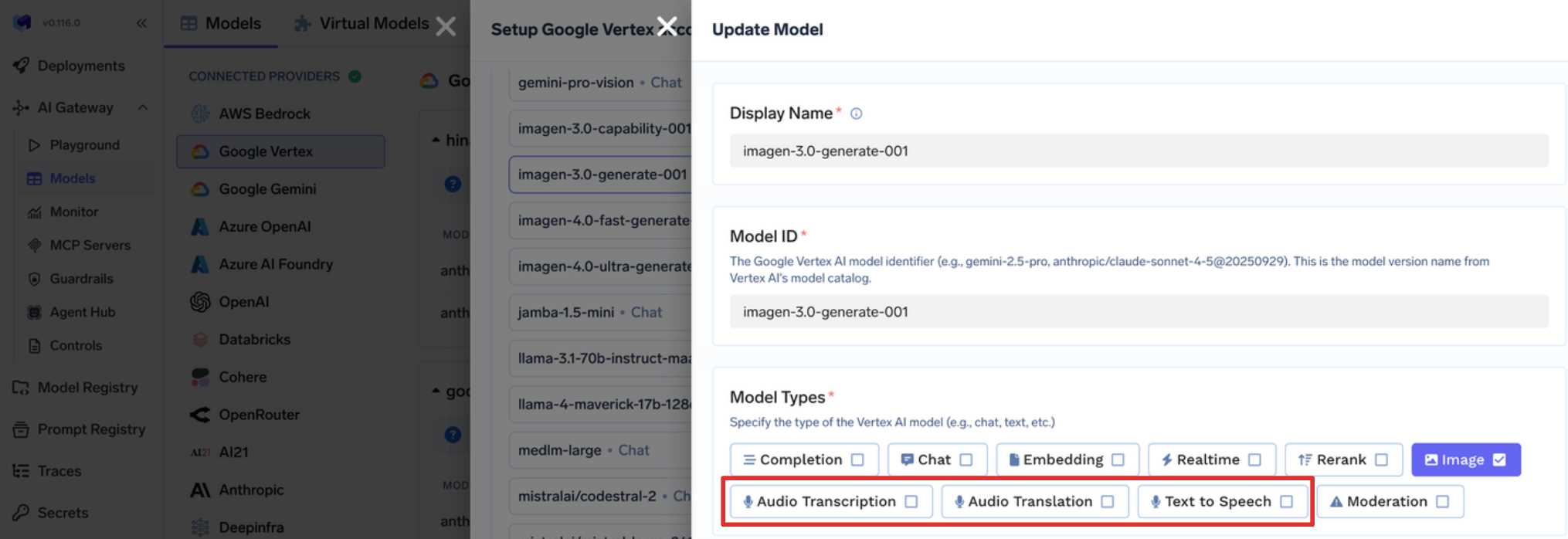 New: Added support for Audio Transcript, Audio Translation & Text to Speech HTTP APIs in Google Vertex models.