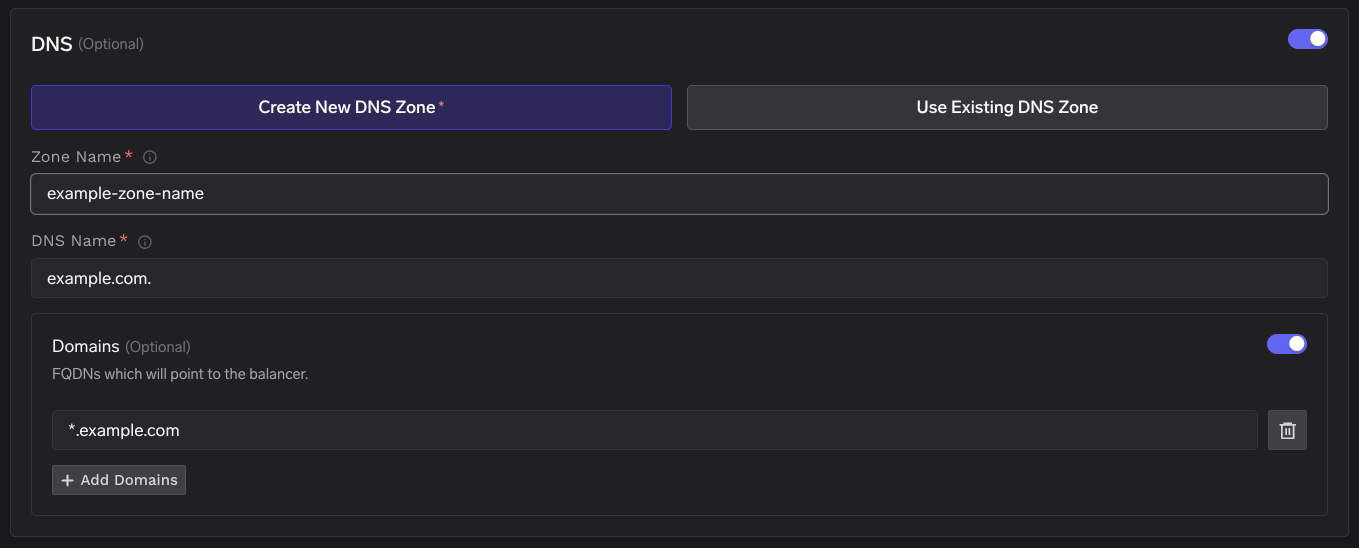 Region- The region where you want to create the cluster.Project ID- The project ID where you want to create the cluster.Cluster Name- A name for your cluster.Cluster VersionandMaster node IPv4 block- The version of the cluster and the IPv4 block for the master nodes.Availability Zones- The availability zones where you want to create the cluster nodes.Resource Tags- Tags to be added to the resources created by TrueFoundry on your behalf if any.Network Configuration- Choose betweenNew networkorExisting networkdepending on your use case.DNS Configuration- Configure the DNS zone and domains that will point to the cluster’s load balancer. This also provisions a TLS certificate for those domains. Select New DNS Zone or Existing DNS Zone if you want TrueFoundry to provision DNS in GCP. If you use an external DNS provider (e.g., Route53, Cloudflare), you can skip this section.