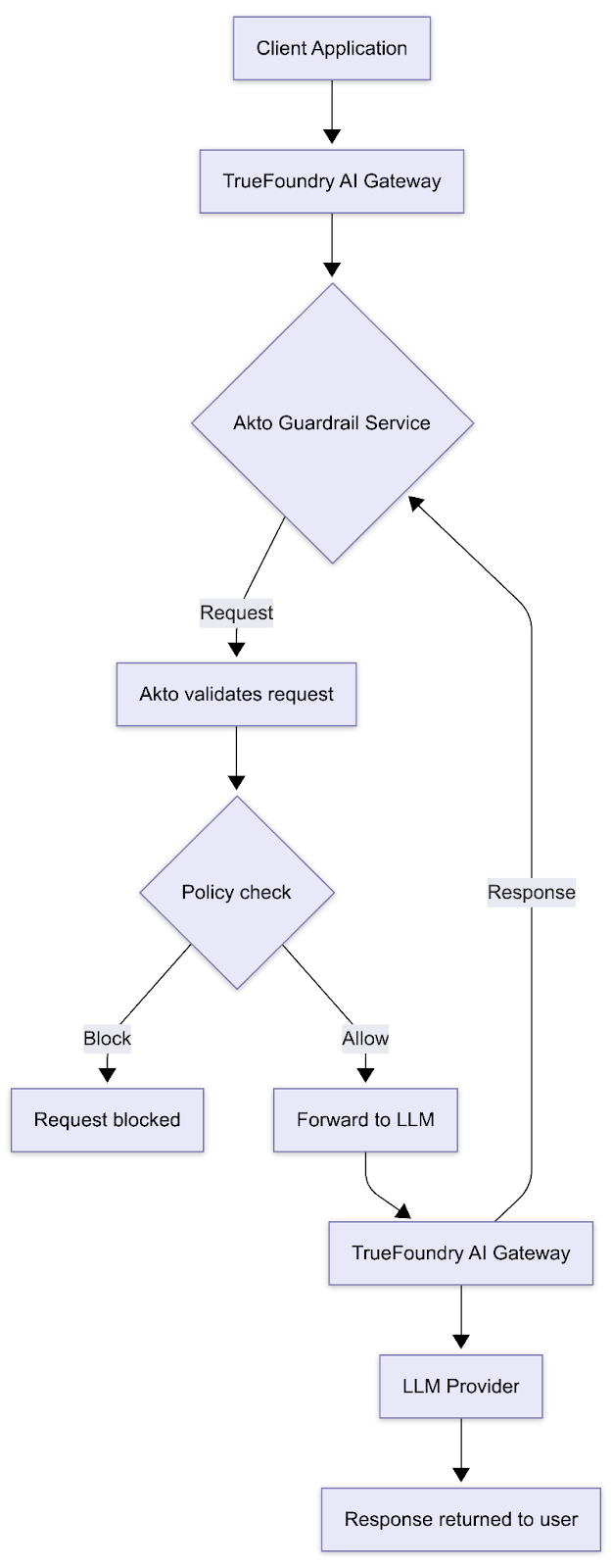 With Akto connected to TrueFoundry AI Gateway, teams can enforce runtime guardrails in the same path where agent traffic is already being routed and governed. That means teams can evaluate and control live AI traffic, not just review traces after execution.