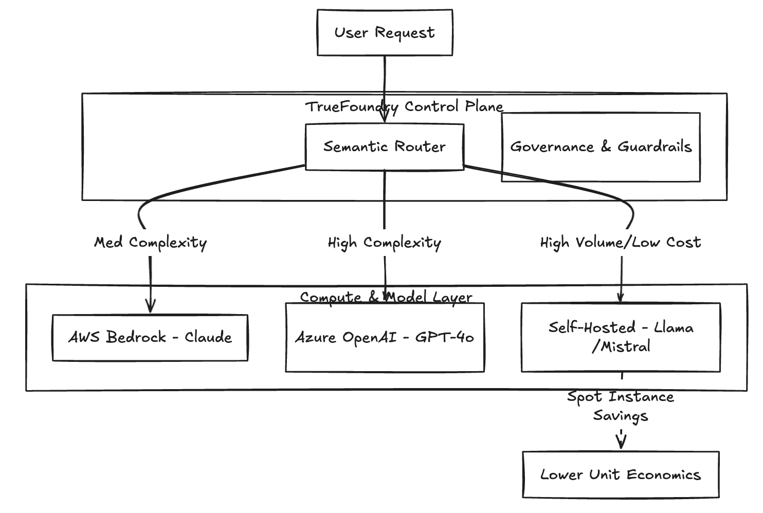 Fig 2: TrueFoundry’s routing logic optimizes unit economics by matching task complexity to the most cost-effective provider.