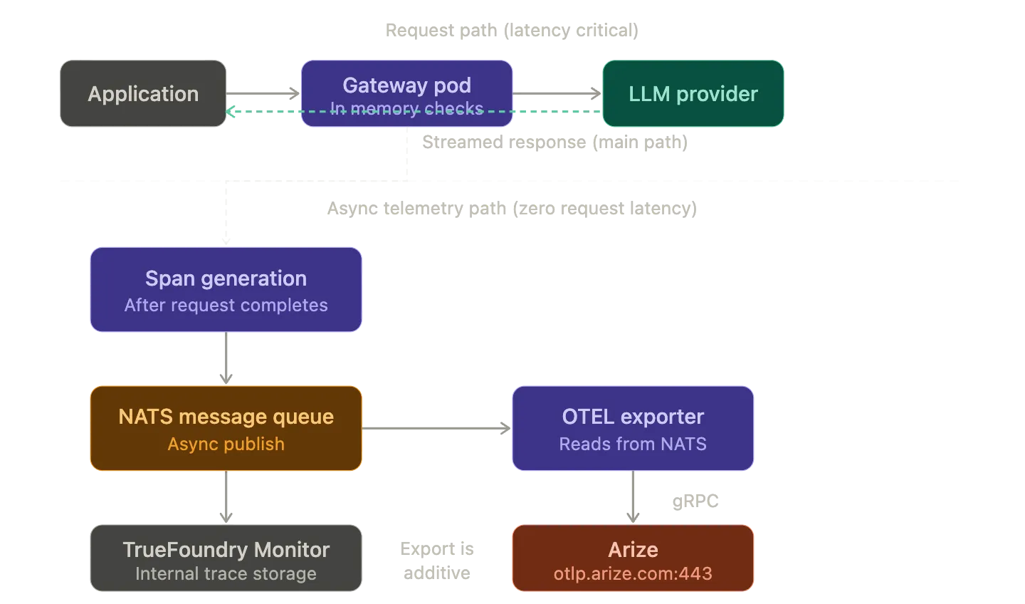 No external calls are added to the inference path. No collector sidecars need to be deployed. No application code changes are required. The gateway is the single instrumentation point and the OTEL export is additive to the gateway's own internal trace storage. You can export to Arize while continuing to use TrueFoundry's built in Monitor UI for the same trace data.