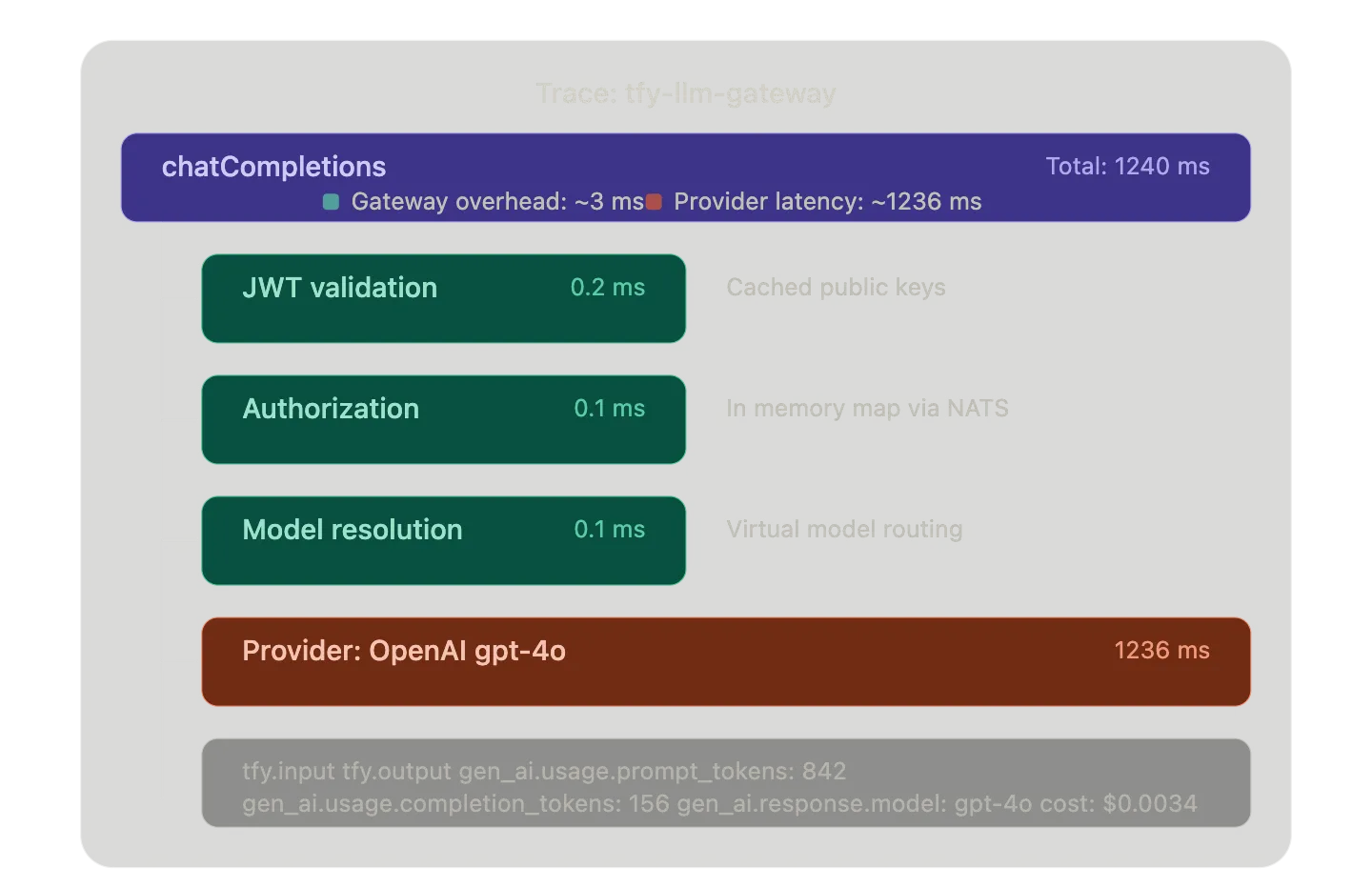 Trace generation happens asynchronously alongside this flow. The gateway creates OTEL spans for each stage of the request lifecycle: the inbound HTTP handler and the authentication check and the model resolution and the outbound provider call and the streaming response. These spans carry attributes that capture token usage and latency and model name and provider and cost estimate and request metadata. After the request completes the gateway publishes the trace data to a NATS message queue. This is the same NATS bus that handles configuration sync between the control plane and gateway pods.