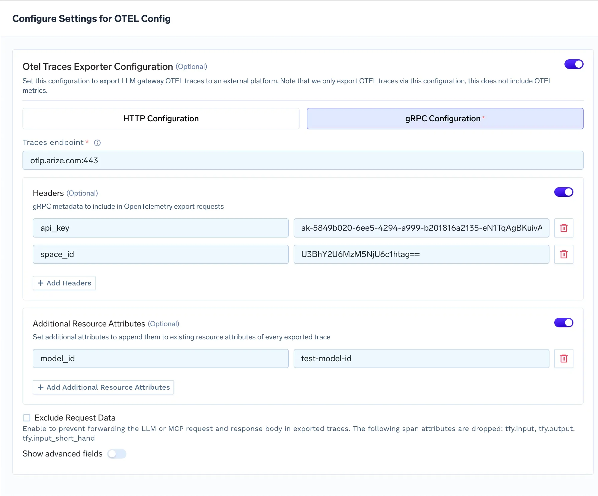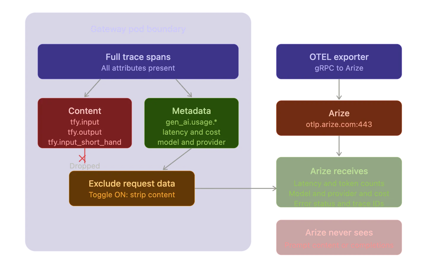 TrueFoundry handles this with the Exclude Request Data toggle in the OTEL exporter configuration. When enabled the gateway drops three span attributes before export: tfy.input and tfy.output and tfy.input_short_hand. Arize still receives the structural trace data (latency and token counts and model metadata and error status) but never sees the actual content of prompts or completions.