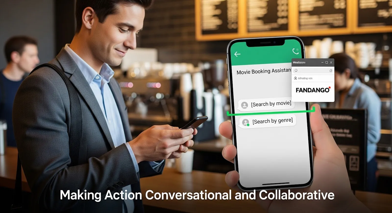 - Initial Guided Choices: The agent (informed by the ADK Agent logic) is designed to present structured choices to the user from the outset. Rather than asking a blank "What movie would you like to see?", it immediately offers guided options such as "[Search by movie] [Search by genre]". When the user makes a selection, it doesn't just get text input; it sets the internal context for the agent, directing the entire subsequent conversation. This initial structure is critical for maintaining task focus.