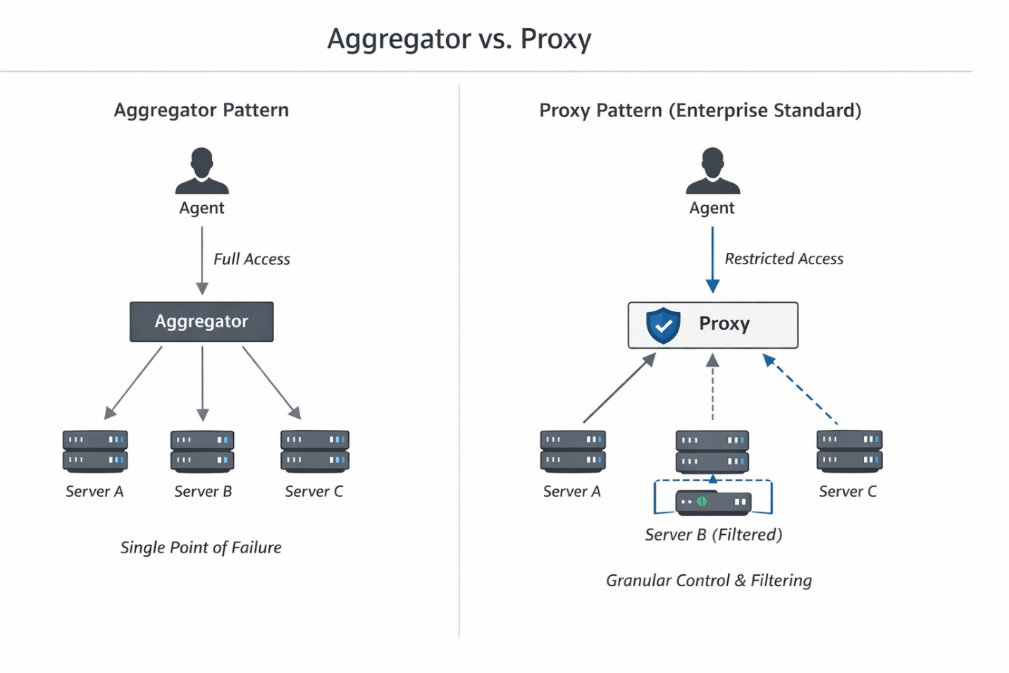 - The Problem: While easy to set up, it becomes a single point of failure. Worse, it usually just passes the full capability list of all connected servers back to the agent. It creates a "God Mode" agent that sees every tool in your stack.