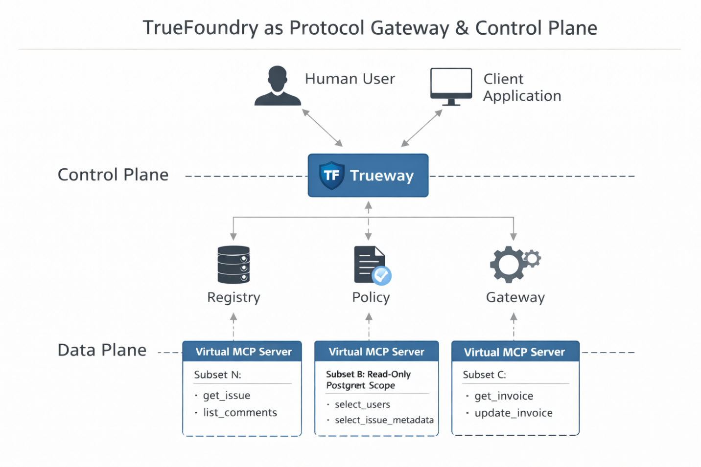 Not as a hosting layer, and not as a convenience wrapper. In a production MCP stack, TrueFoundry functions as the protocol gateway and control plane. It sits directly in the execution path between the LLM runtime and the tools, where enforcement is still possible.
