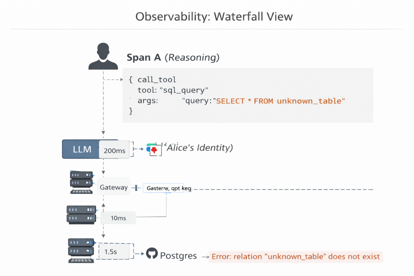 - Span C (Tool Execution): The Postgres container takes 1.5s to run the query.