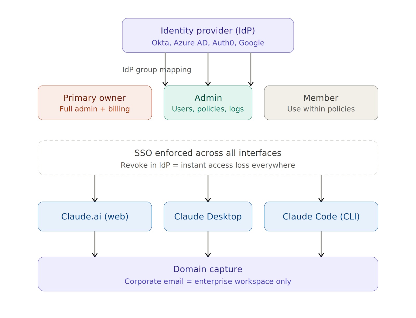 - Map your Identity Provider (IdP) groups to Claude roles. Primary Owner gets full admin access, including billing. Admin manages users, policies, and audit logs, but cannot touch billing, and Member uses Claude within admin-defined policies.
