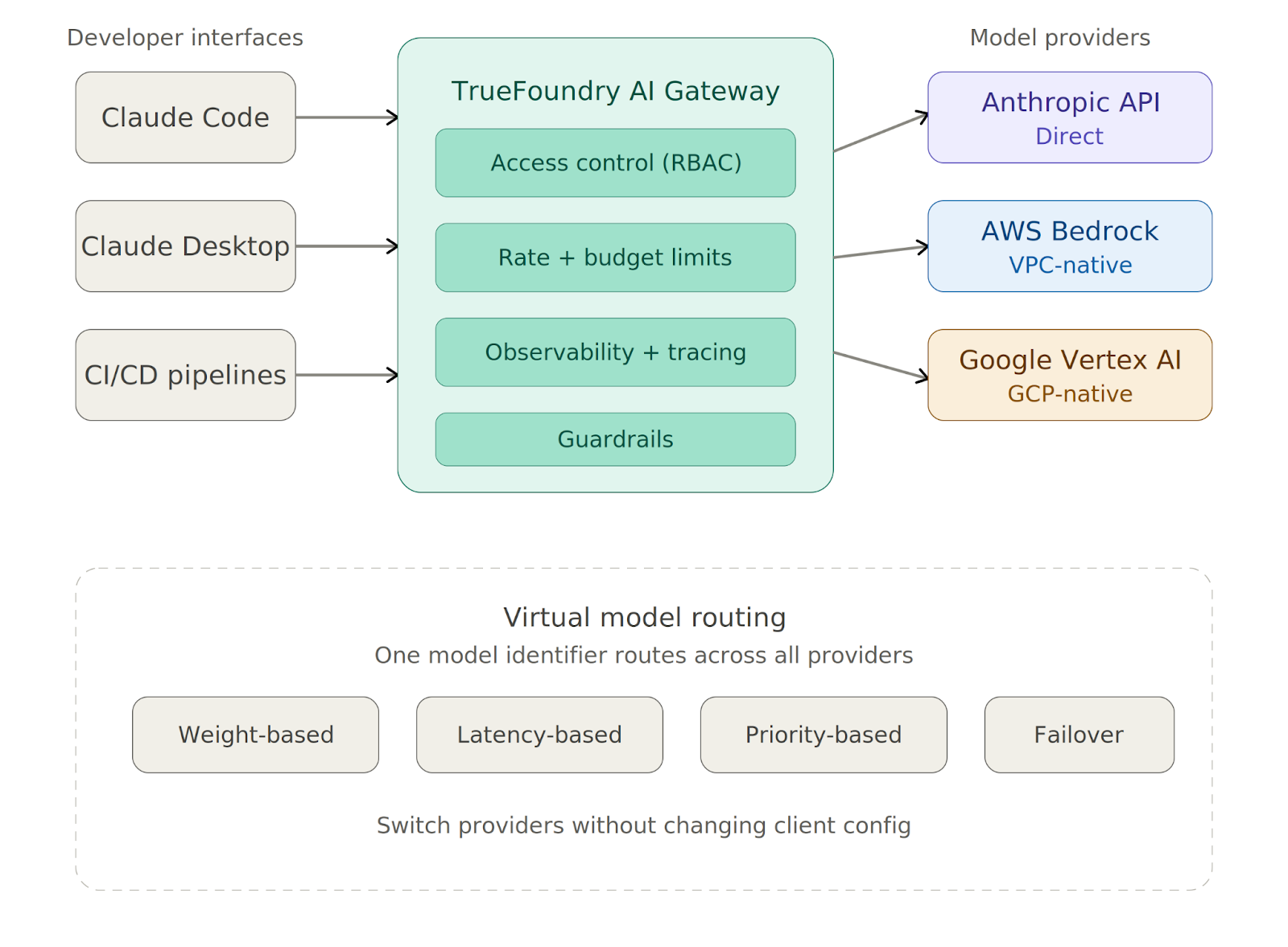 export ANTHROPIC_BASE_URL=https://<your-truefoundry-gateway-url>From there, you add provider accounts in the Gateway dashboard, and Claude Code reaches all of them — Anthropic, Bedrock, Vertex — via a single endpoint. Virtual Models let you create a single model identifier that routes across providers with weight-based or latency-based logic, and you can switch providers without touching any client configuration.