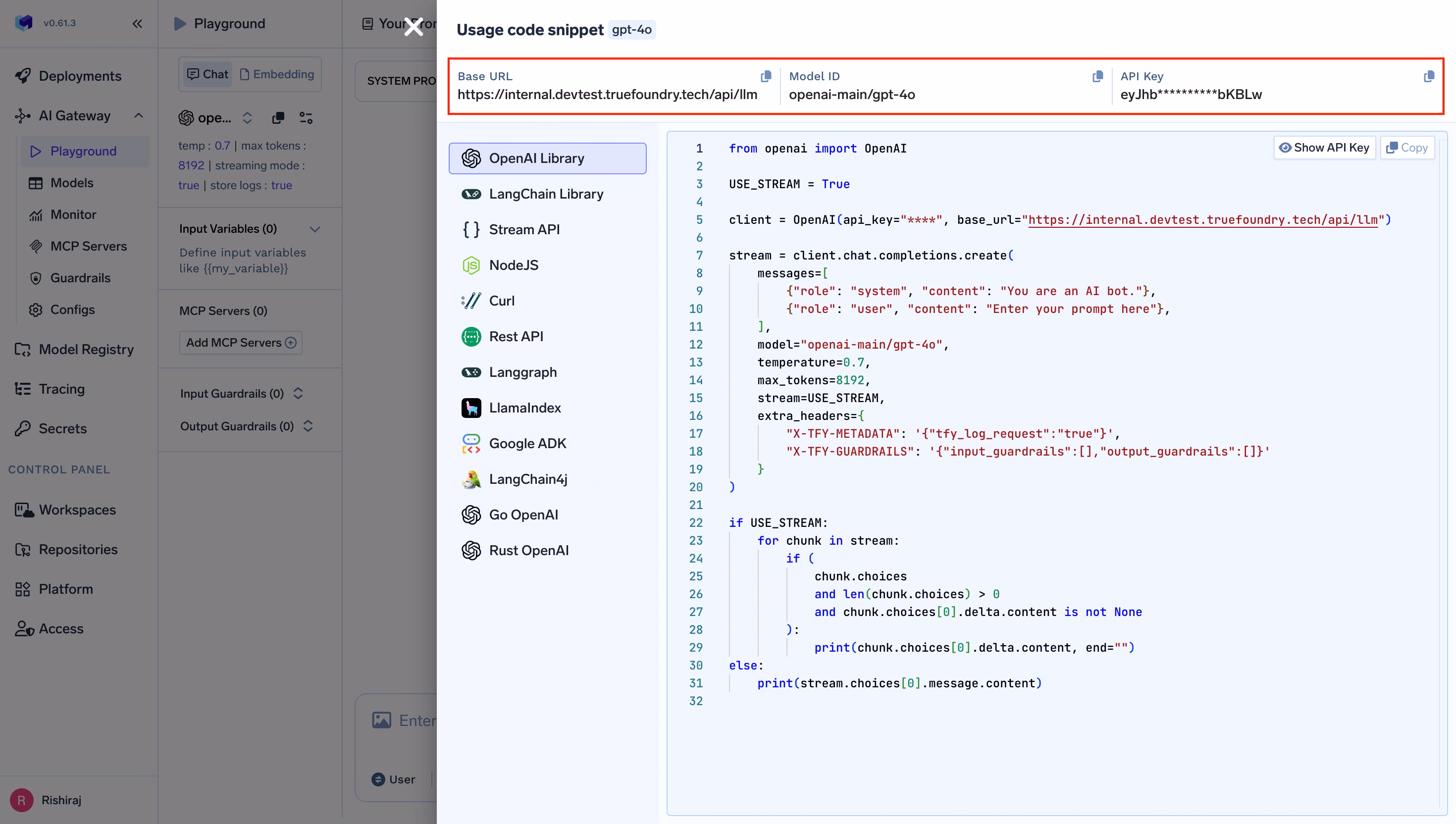 A core theme across the IDE guides is simple. You pull the base URL and model name from the TrueFoundry AI Gateway playground. Then you configure the IDE or CLI to use that base URL and a TrueFoundry token.