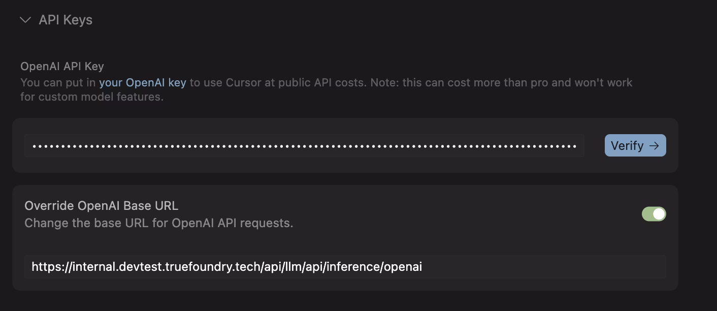 Most AI coding IDEs and desktop tools can be pointed to a single OpenAI compatible endpoint. The TrueFoundry AI Gateway gives you that endpoint. You start in the Gateway playground and copy the unified snippet. This snippet gives you the base URL and the model name you should use. You then open the IDE settings and select a provider option that supports a custom base URL. Many tools call this OpenAI compatible. You paste the Gateway base URL. You paste a TrueFoundry token as the API key. The token can be a personal token for a developer or a virtual account token for shared or automated usage. TrueFoundry documents both options and recommends the virtual account token for production style use. Read more here