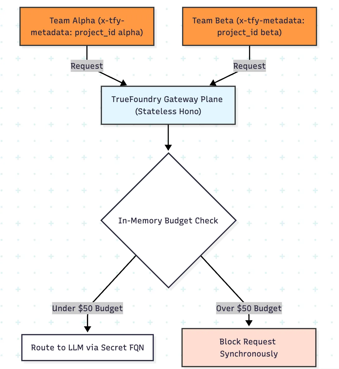 The especially useful part for hackathons is metadata scoping. Instead of hand-authoring one rule per team, you can attach team identity in x-tfy-metadata and apply policy dynamically with fields such as metadata.project_id. That means one budget rule and one rate-limit rule can fan out into isolated counters and spend envelopes per team.