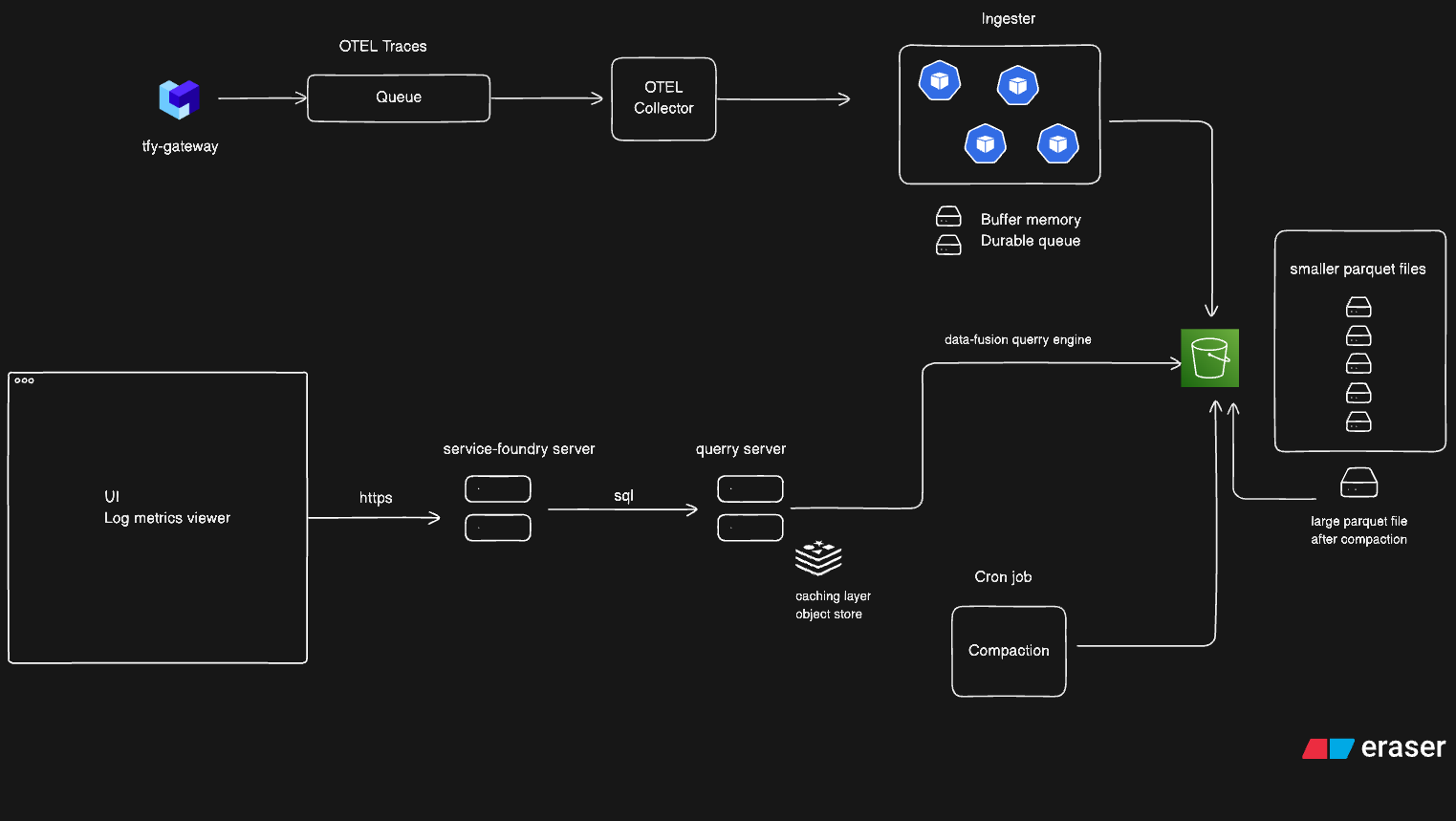 We use DataFusion, a query engine from the Apache project. It's a modern, stateless engine that reads Parquet files directly from S3. To overcome S3's inherent network latency, we built a sophisticated multi-level caching layer (in-memory and on-disk) that keeps hot data ready for querying, delivering a fast and responsive UI experience.