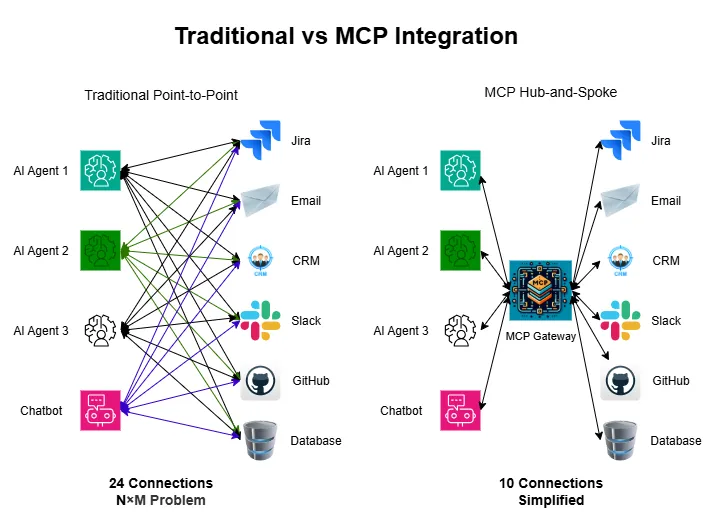 This diagram illustrates the fundamental advantage of MCP architecture. Traditional approaches require N×M custom integrations between each AI application and business system, creating exponential complexity. MCP's hub-and-spoke model centralizes these connections through a single gateway, dramatically reducing integration overhead.