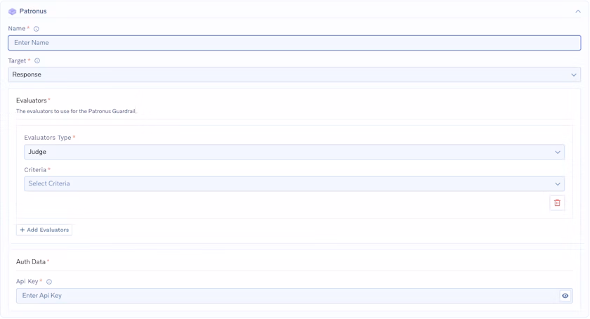 ). - Evaluators: Configure the evaluators to use for the Patronus Guardrail.