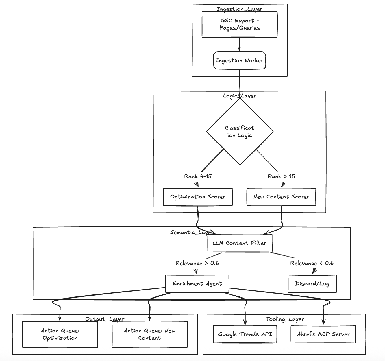 - Trend Divergence: A common failure mode in SEO is optimizing for a dying keyword. Our Enrichment Worker checks Google Trends. If Impression_Trend is flat but Market_Trend is rising, it flags a "Missed Opportunity." If Impression_Trend is rising but Market_Trend is zero, it flags a likely bot anomaly or seasonal spike, preventing wasted effort.
