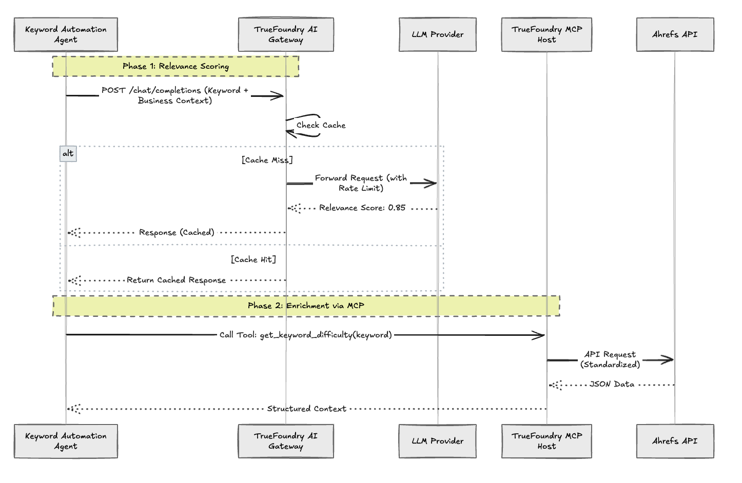 At TrueFoundry, we realized our growth engineering workflow was blocked by this manual aggregation. We weren't limited by data; we were limited by the throughput of human analysis. To fix this, we didn't buy another dashboard tool. We built the Keyword Automation Agent, a system that treats SEO metrics as an engineering stream rather than a static report, powered by the TrueFoundry AI Gateway and the Model Context Protocol (MCP).