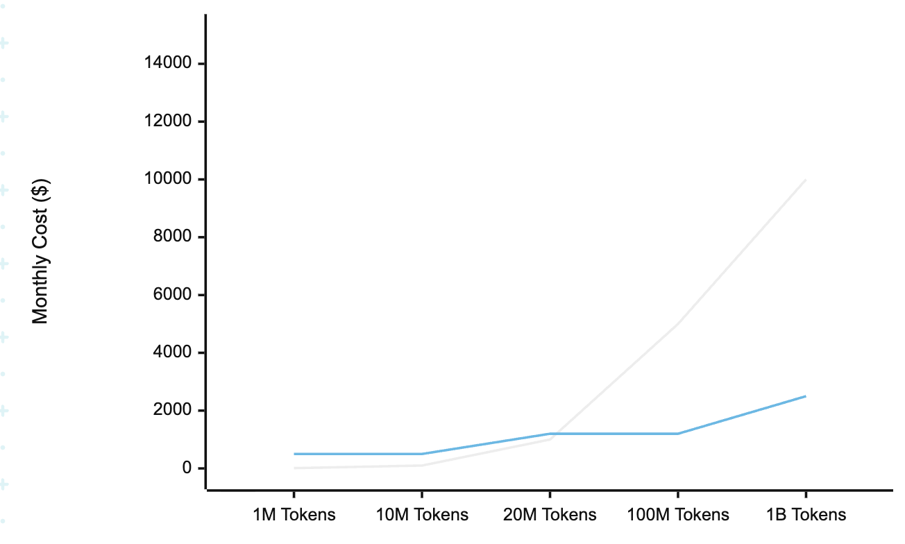 Note on Fig 2: The gray line represents Managed API (Token) costs which scale linearly. The blue line represents Self-Hosted costs (via TrueFoundry), which remain flat (step-function) based on provisioned GPU capacity. The crossover point typically occurs around 10-20M tokens per month, after which self-hosting becomes significantly cheaper.