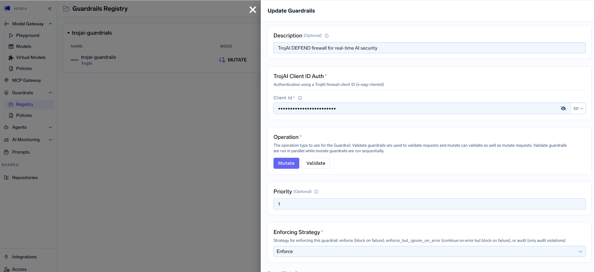 In the TrojAI console, users first create a policy and select the relevant rulesets for inspecting their application traffic (e.g., prompt injection, data leakage). Once the policy is built, users can enable the TrojAI integration within TrueFoundry by providing the applicable client ID and service URL.