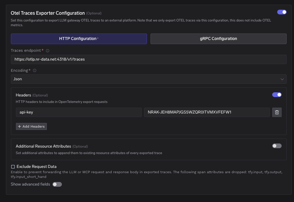 You configure an OpenTelemetry traces exporter in the TrueFoundry AI Gateway UI. You point it to a New Relic OTLP traces endpoint. You add the right authentication header using a New Relic ingest license key generated from the OpenTelemetry integration in New Relic.