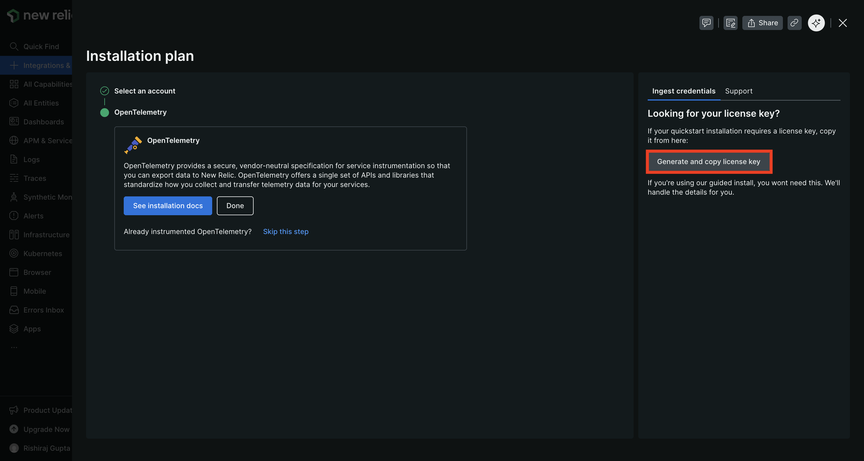 Open your New Relic dashboard. Go to Integrations and Agents. Search for OpenTelemetry and open that integration. In the installation plan find the ingest credentials area and generate the license key.