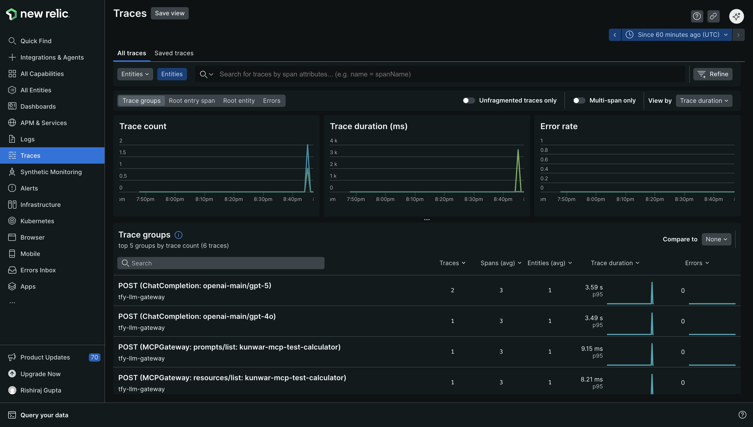 New Relic is an observability platform that supports full stack monitoring and application performance monitoring with real time analytics. It can ingest OpenTelemetry data. This makes it a natural place to analyze LLM traces from the gateway with the same workflows you already use for services and infrastructure.