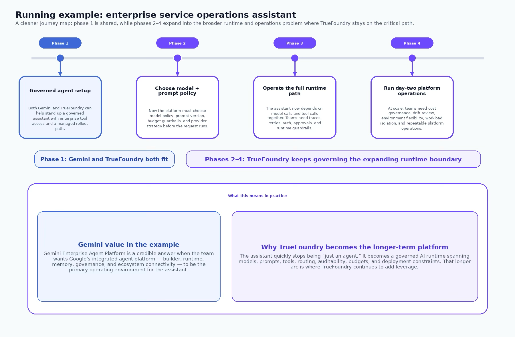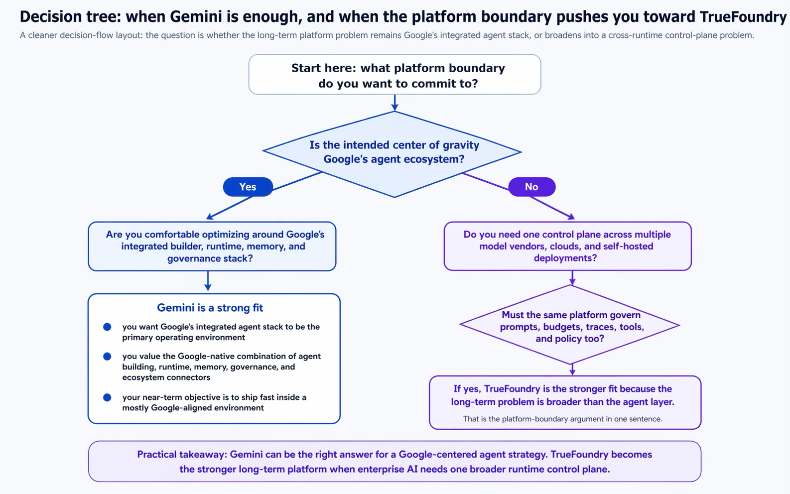 So the conclusion is not “Gemini cannot do enterprise agents.” It clearly can. The practical conclusion is this: Gemini is best suited when the enterprise wants Google’s agent platform to be the center of gravity. TrueFoundry is better suited when the enterprise wants a broader, more portable AI runtime control plane that remains useful as the platform scope expands.
