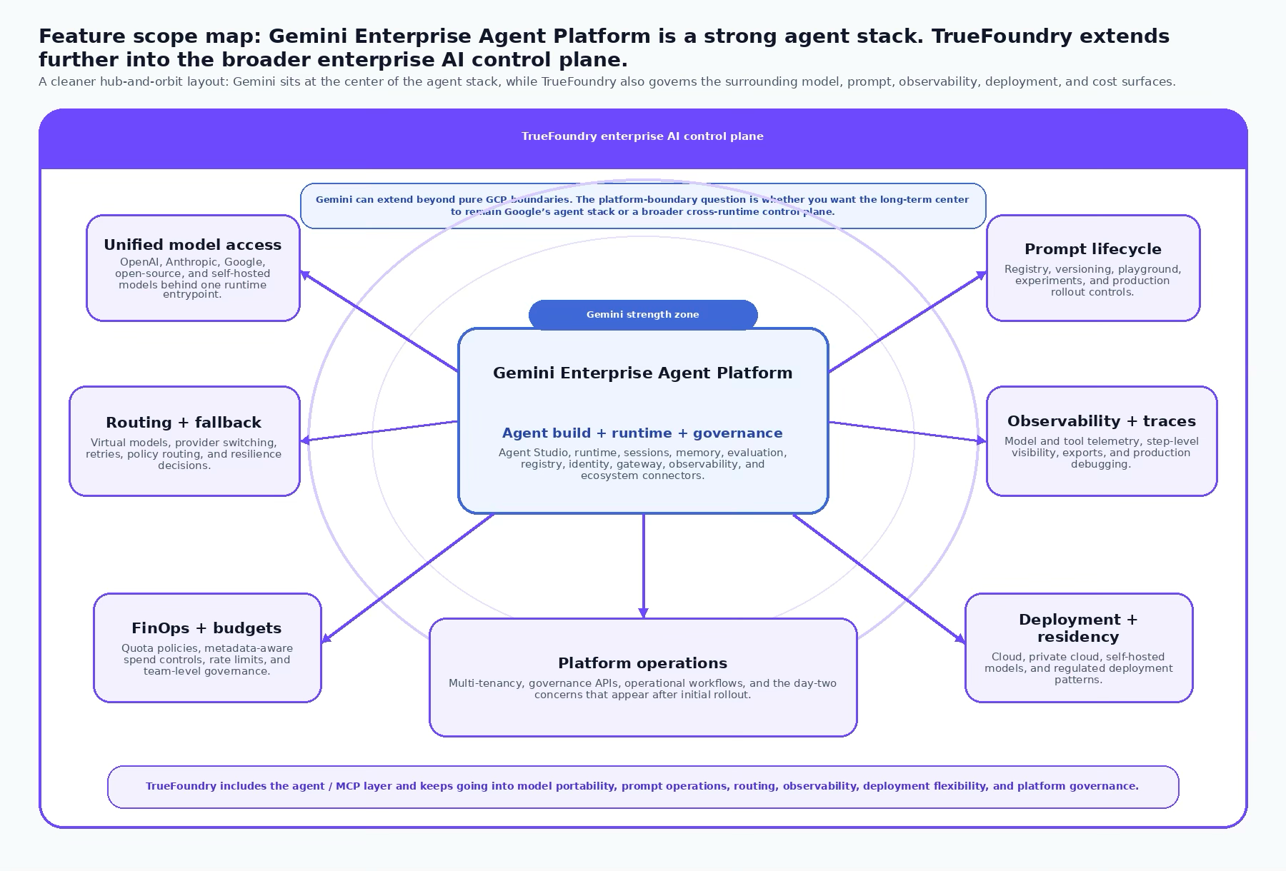 That is the core argument of this blog. It is not anti-Google. It is a platform-boundary claim: Gemini Enterprise Agent Platform is best understood as Google’s integrated agent platform. TrueFoundry is best understood as a cross-runtime enterprise AI platform layer.