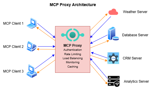 An MCP Proxy serves as an intelligent intermediary layer that sits between MCP clients (AI applications) and MCP servers (data sources and tools). Rather than establishing direct connections, the proxy acts as a centralized gateway that manages, routes, and enhances communication between these components.