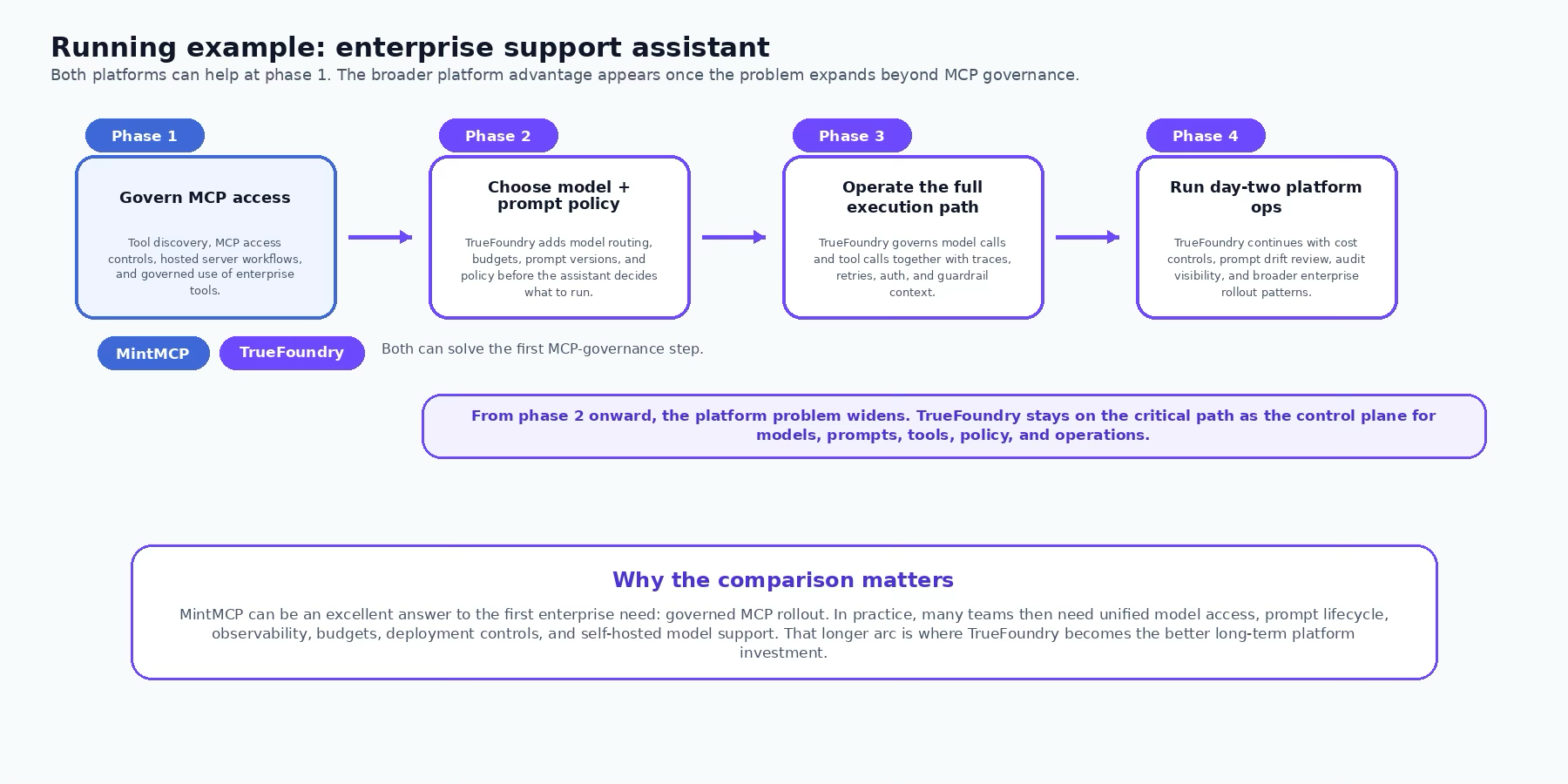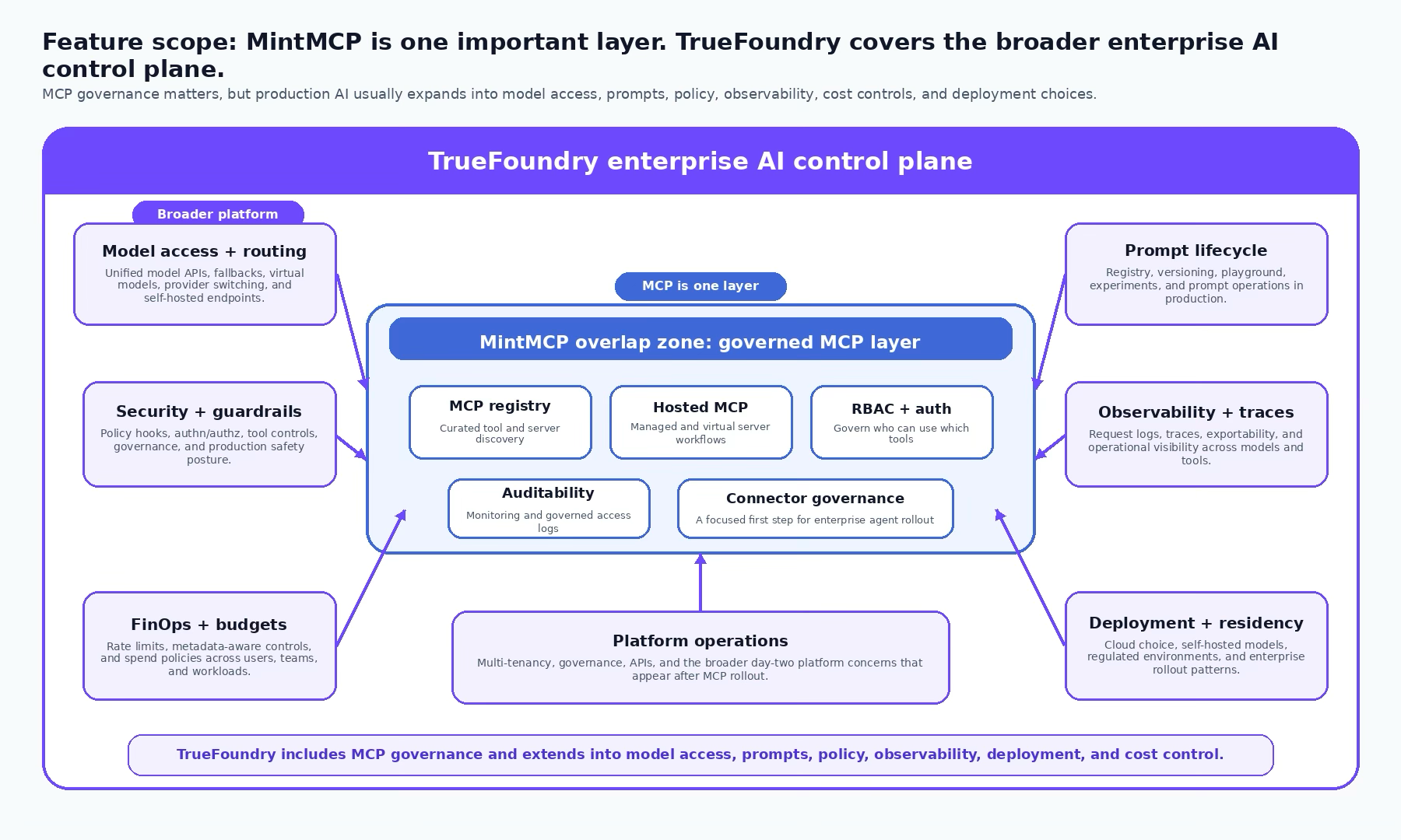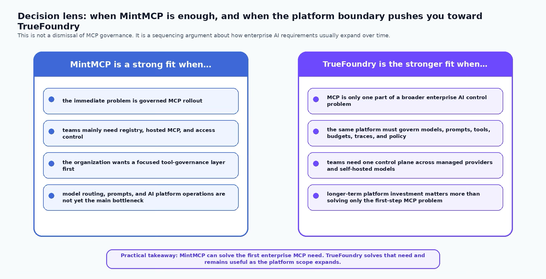 If the immediate enterprise task is to roll out governed MCP quickly, MintMCP is a respectable answer. If the actual platform roadmap is heading toward mixed model estates, per-team budgets, prompt lifecycle, traces, self-hosted inference, and deeper day-two operations, TrueFoundry is the stronger long-term investment. That is the framing we would stand behind publicly: respect the narrower product, but choose the broader control plane.