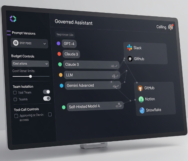 Think about a support assistant used by engineering and customer-success teams. It needs GitHub, Slack, Notion, ticketing tools, and internal docs through MCP. But it also needs model choice, per-team budgets, prompt versions, guardrails before and after tool calls, traces for incident review, and a deployment posture that can mix managed providers with self-hosted models.