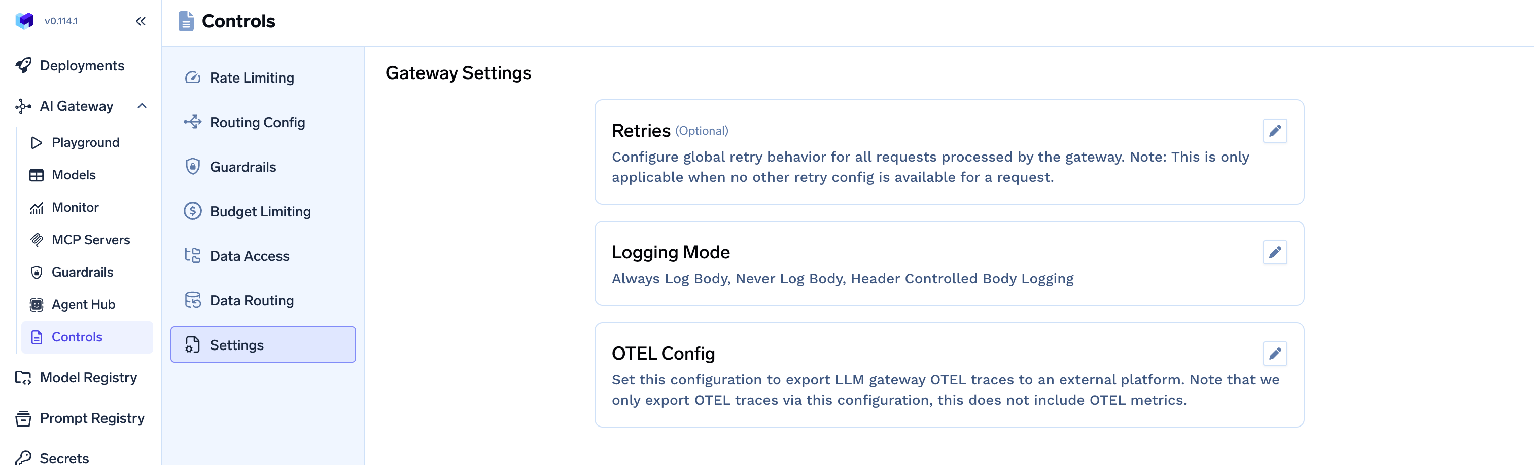 You can now configure Global AI Gateway related settings from Control. These settings Retry, Logging Mode, Additional OTEL Config.
