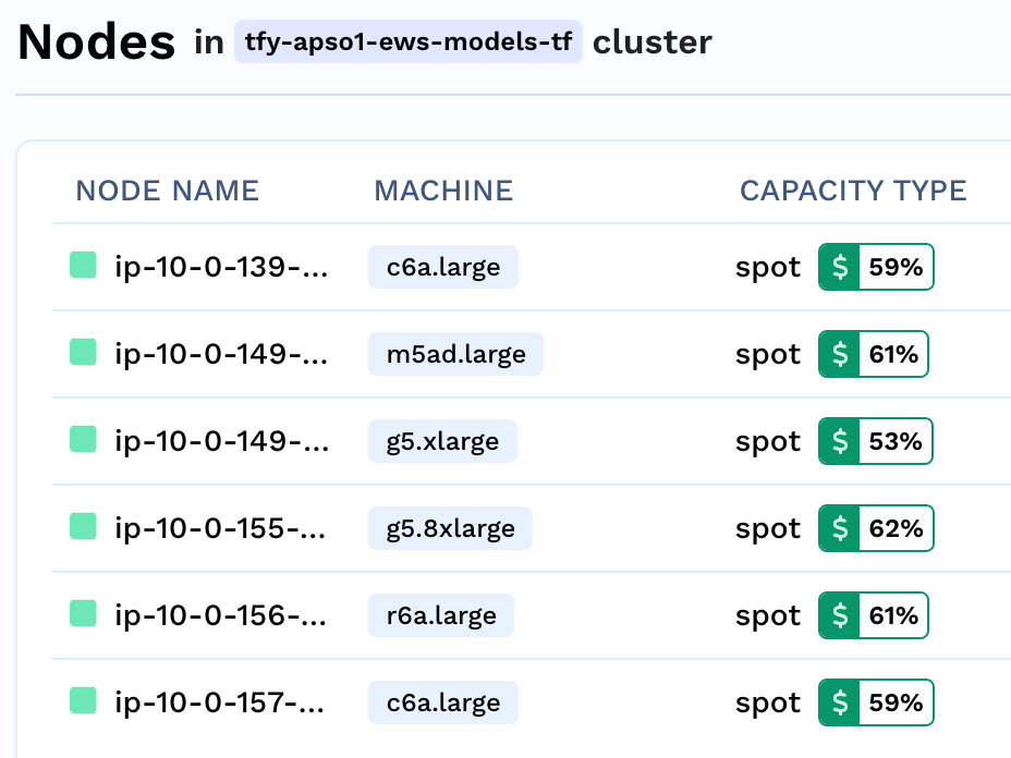 - Uso puntual y escalado automático: El equipo no tuvo que hacer ningún esfuerzo adicional para configurar el uso de instancias puntuales para sus servicios. Las instancias también se redujeron cuando el tráfico era bajo. Gracias al mecanismo de confiabilidad de TrueFoundry para la configuración de uso puntual y escalado automático, el equipo ahorró más de 100 000 dólares durante el período piloto.