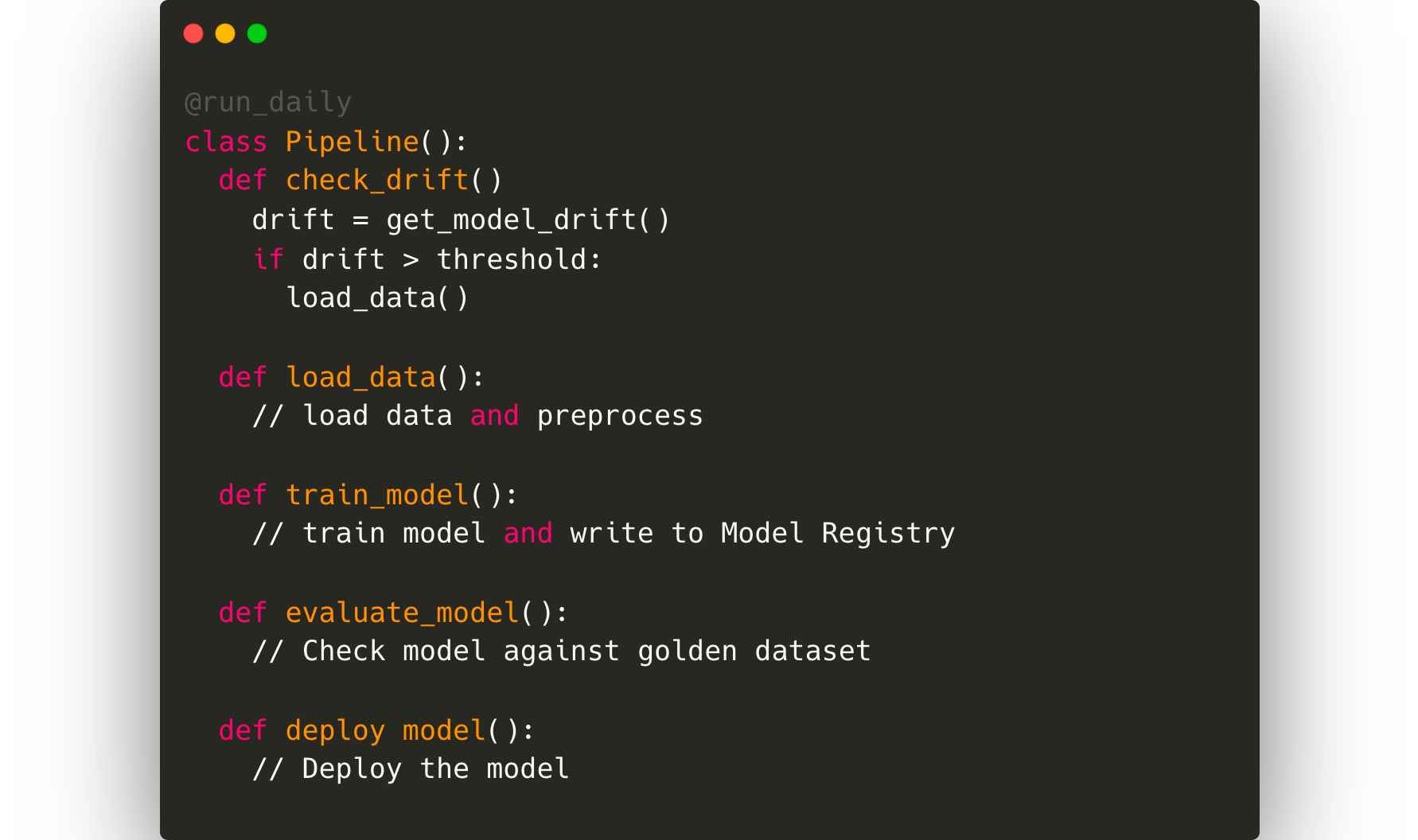 Una vez que se haya ordenado todo el monitoreo, lo ideal es que el científico de datos automatice todo el ciclo de reentrenamiento. Esto requerirá un marco de orquestación de canalizaciones como Kubeflow o Airflow.