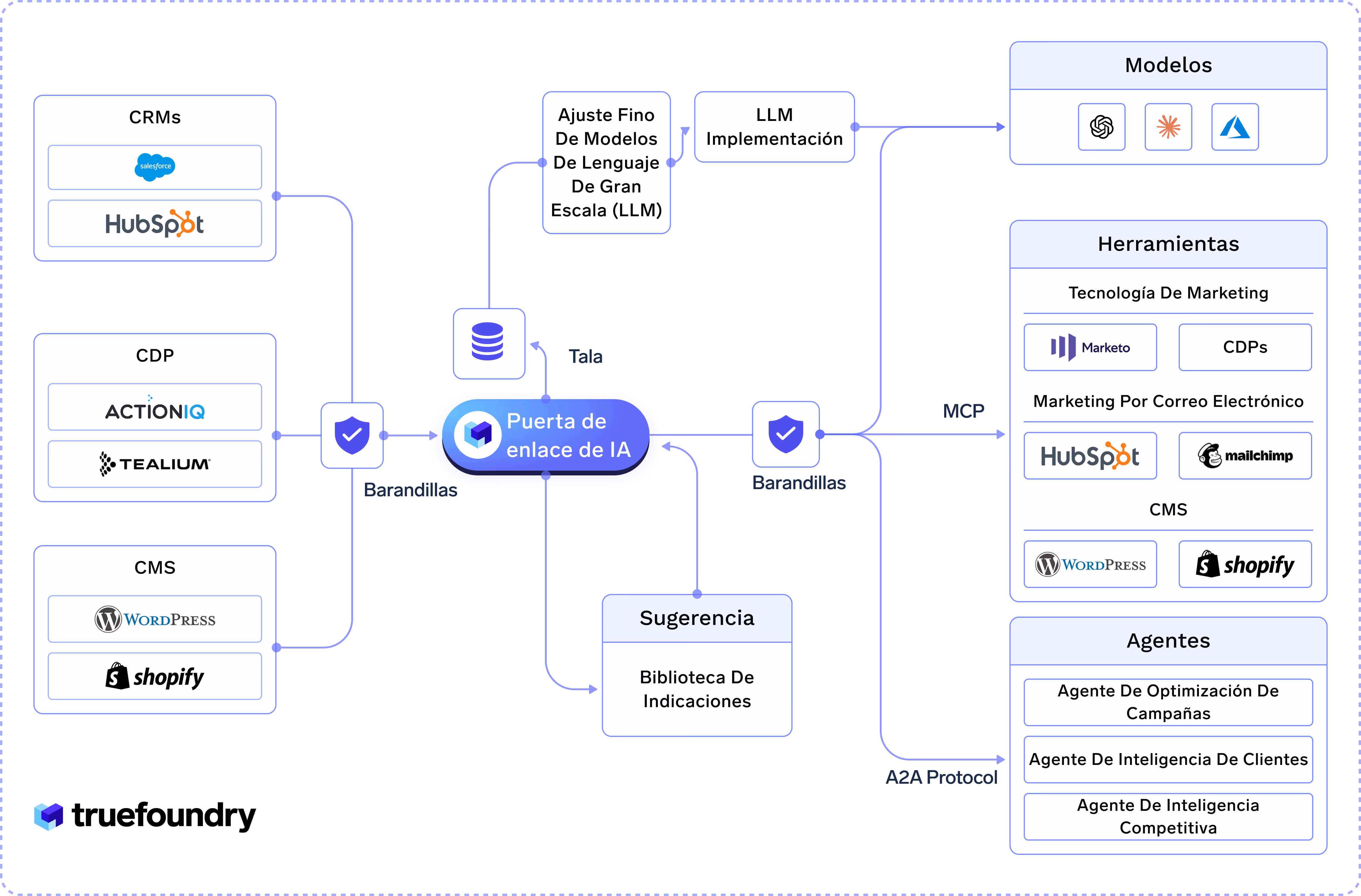 - Conecte a los agentes de forma segura con Salesforce, Adobe Experience Cloud, los CDP y los administradores de anuncios a través de un MCP Gateway para automatizar la segmentación, la creación de variantes y la activación.