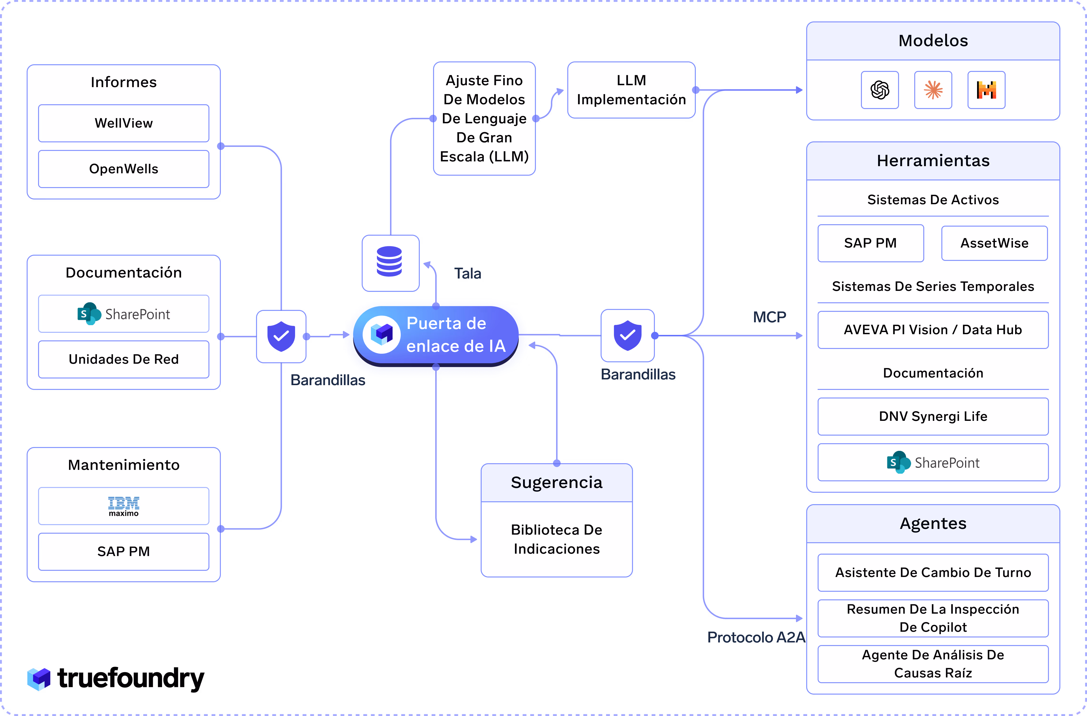 - Utilice MCP Gateway de TrueFoundry para registrar de forma centralizada a los agentes y garantizar el acceso específico de cada disciplina a los extractos de SAP PM, los informes de inspección, los registros de alarmas/eventos, etc.