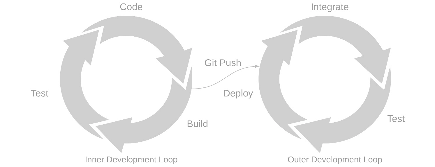 - Boucle de développement interne - Le processus implique l'écriture, la compilation et le test d'un morceau de code sur le poste de travail du développeur. Cette boucle se poursuit jusqu'à ce qu'un morceau de code satisfaisant soit déplacé vers Git.