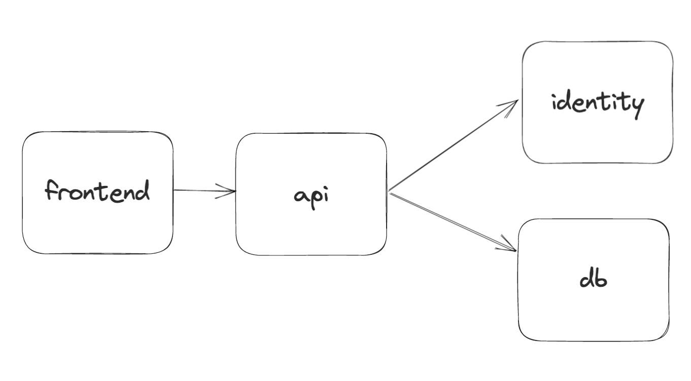 Considérons une configuration simple où frontend appelle le api, qui communique à son tour avec deux autres services appelés identité et db. Dans ce scénario, notre développeur travaille sur api couche, qui possède à la fois des dépendances en aval (frontend) et en amont (identity, db). Explorons comment le processus de développement du api changements de service dans les deux boucles de développement différentes -