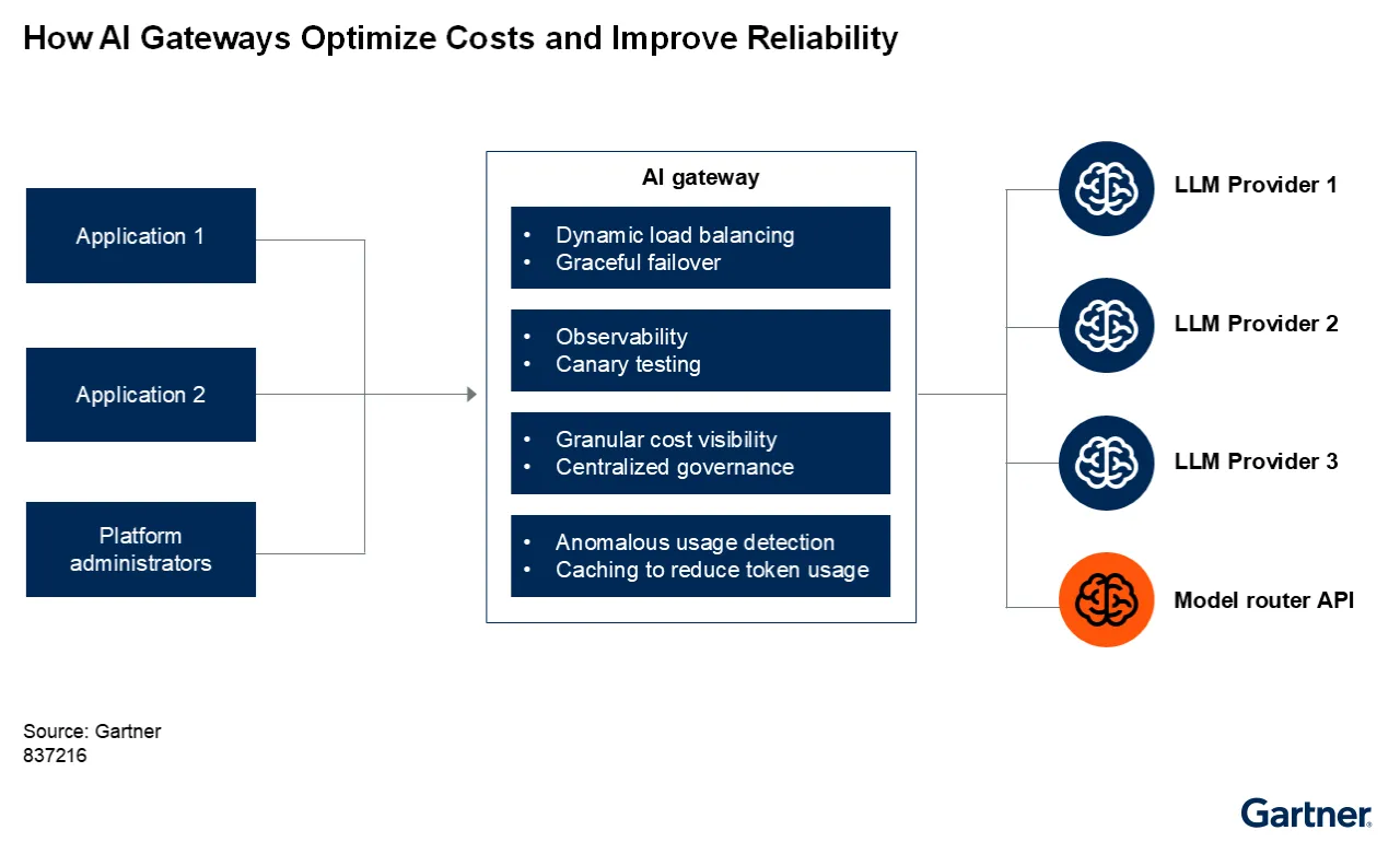 Gartner définit une passerelle IA comme un intergiciel situé entre les applications et les services ou modèles d'IA, gérant la sécurité, l'observabilité et l'optimisation des coûts.