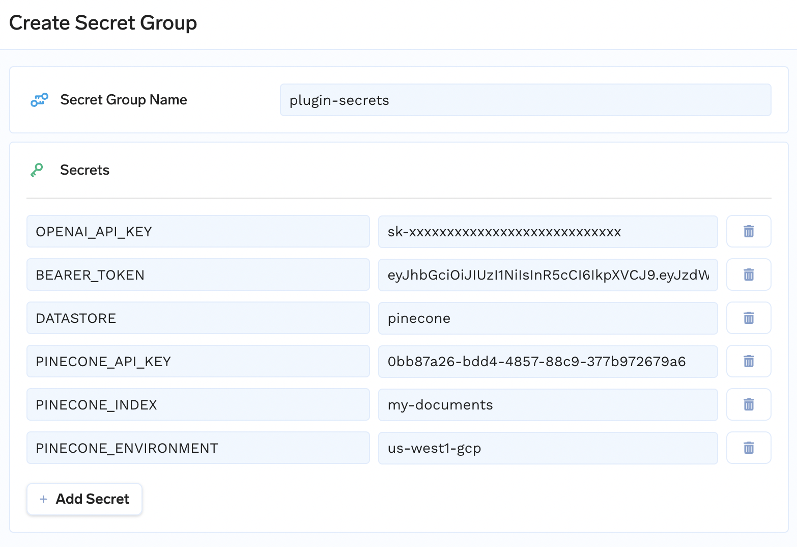 NameRequiredDescriptionDataStoreYesDataStore name, définissez-le sur PineconeBearer_TokenyesVotre jeton secret pour authentifier les demandes adressées à l'APIOpenAI_API_KeyyesVotre clé d'API OpenAI pour générer des intégrations avec le text-embedding-ada-002 modelPinecone_API_KeyyesVotre clé d'API Pinecone, trouvée dans la console Pinecone Pinecone_EnvironmentyesVotre clé d'API Pinecone, trouvée dans la console Pinecone Pinecone_EnvironmentyesVotre clé d'API Pinecone, trouvée dans la console Pinecone, disponible dans la console Pinecone, par exemple us-west1-gcp, us-east-1-aws, etc.Pinecone_IndexYesLe nom d'index Pinecone que vous avez choisi. Remarque : le nom de l'index doit être composé de caractères alphanumériques minuscules ou de « - »