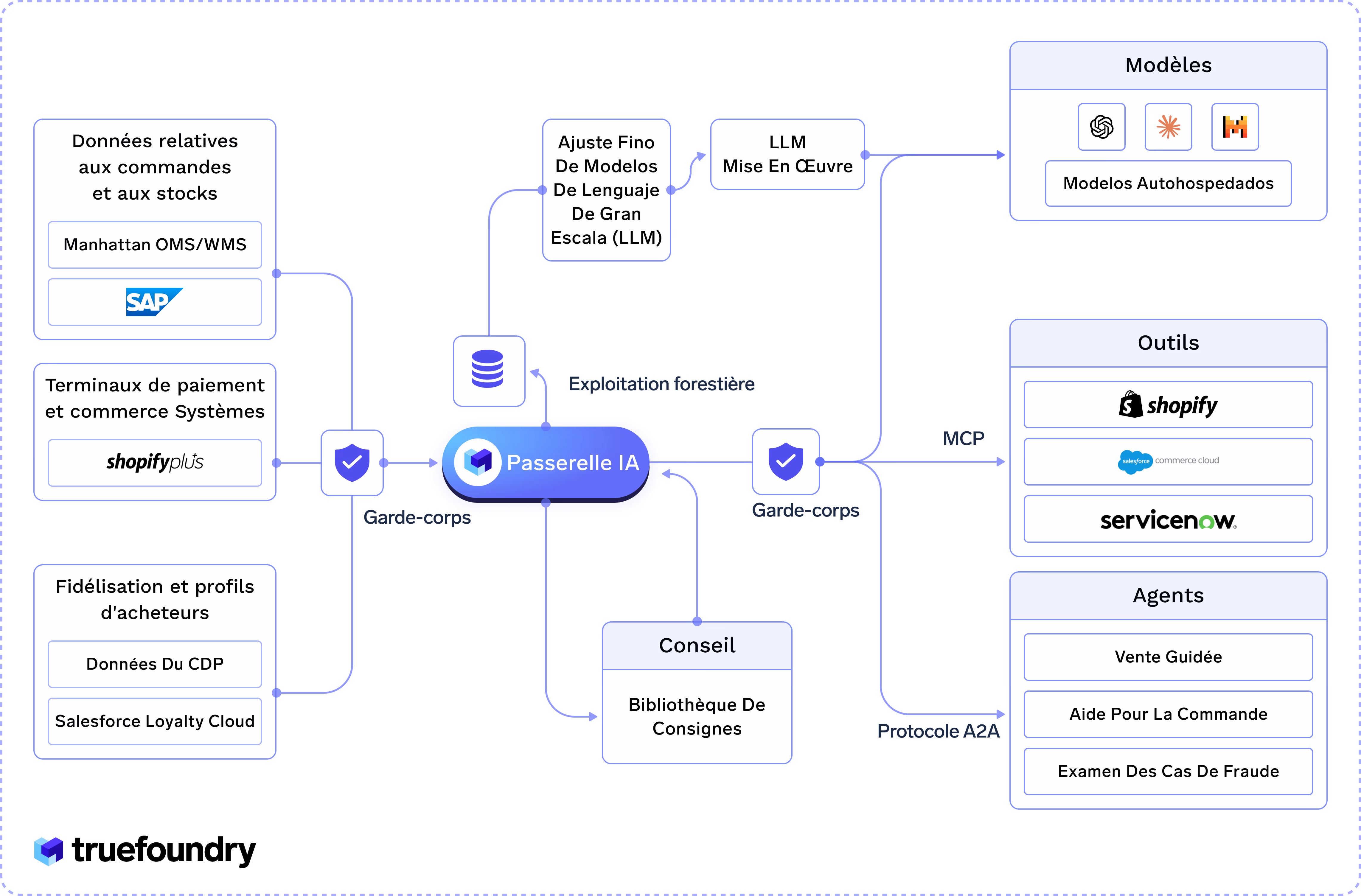 - Grâce à la passerelle MCP de TrueFoundry, les agents IA peuvent interagir en toute sécurité avec les systèmes de gestion des commandes, d'inventaire, de fidélité et d'exécution