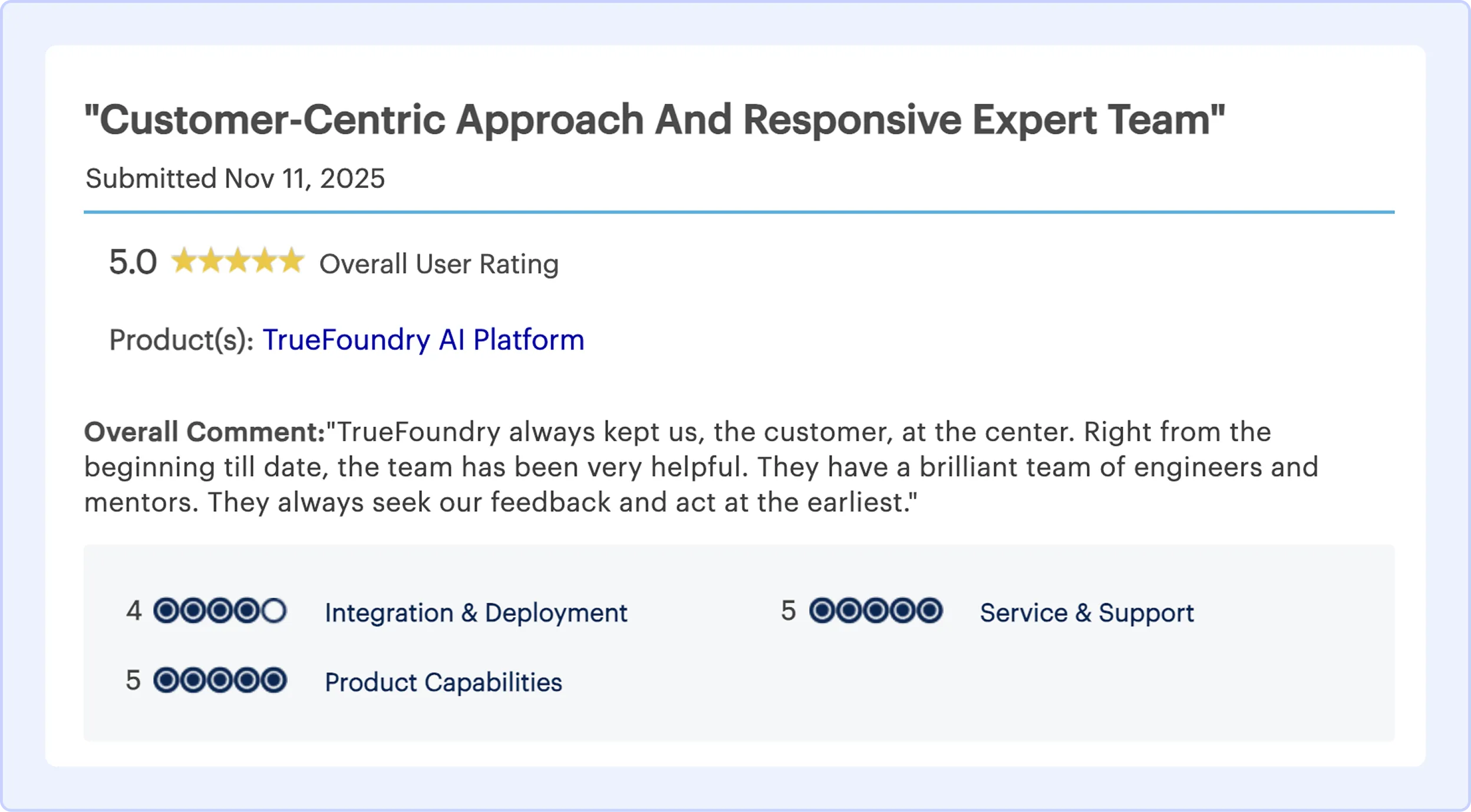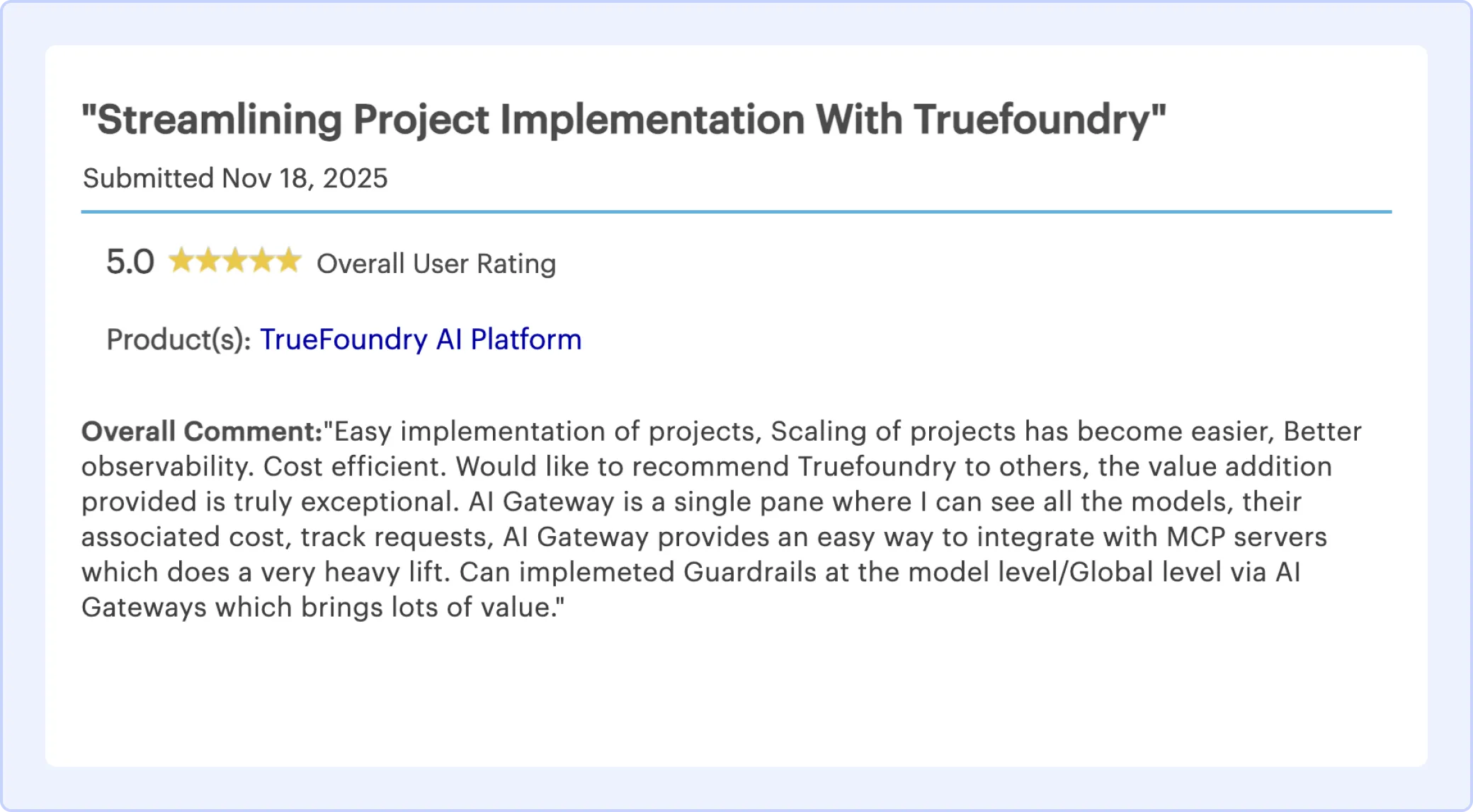 TrueFoundry is the AI Gateway platform of choice for leading enterprises and Fortune 500 companies. 96% of reviewers are likely to recommend TrueFoundry and our users have rated us 4.9 for ease of deployment, administration, and maintenance.